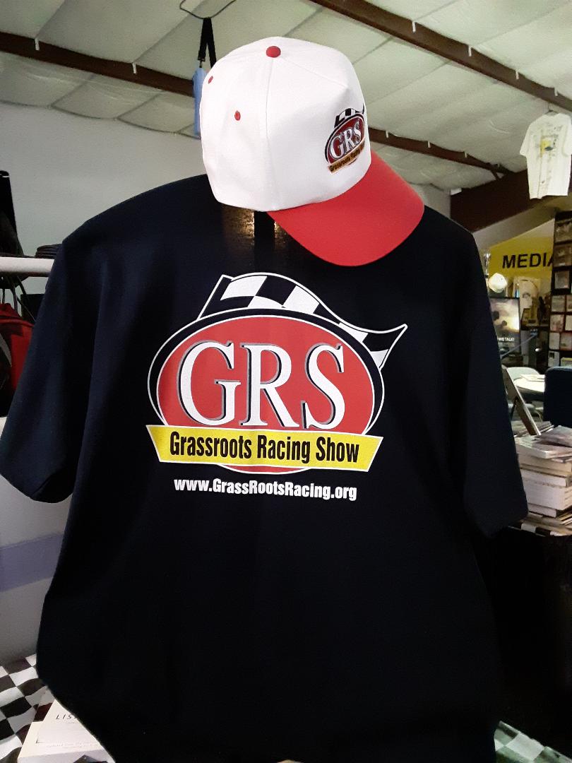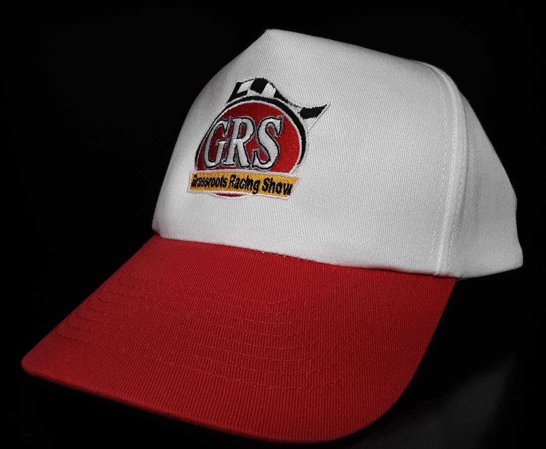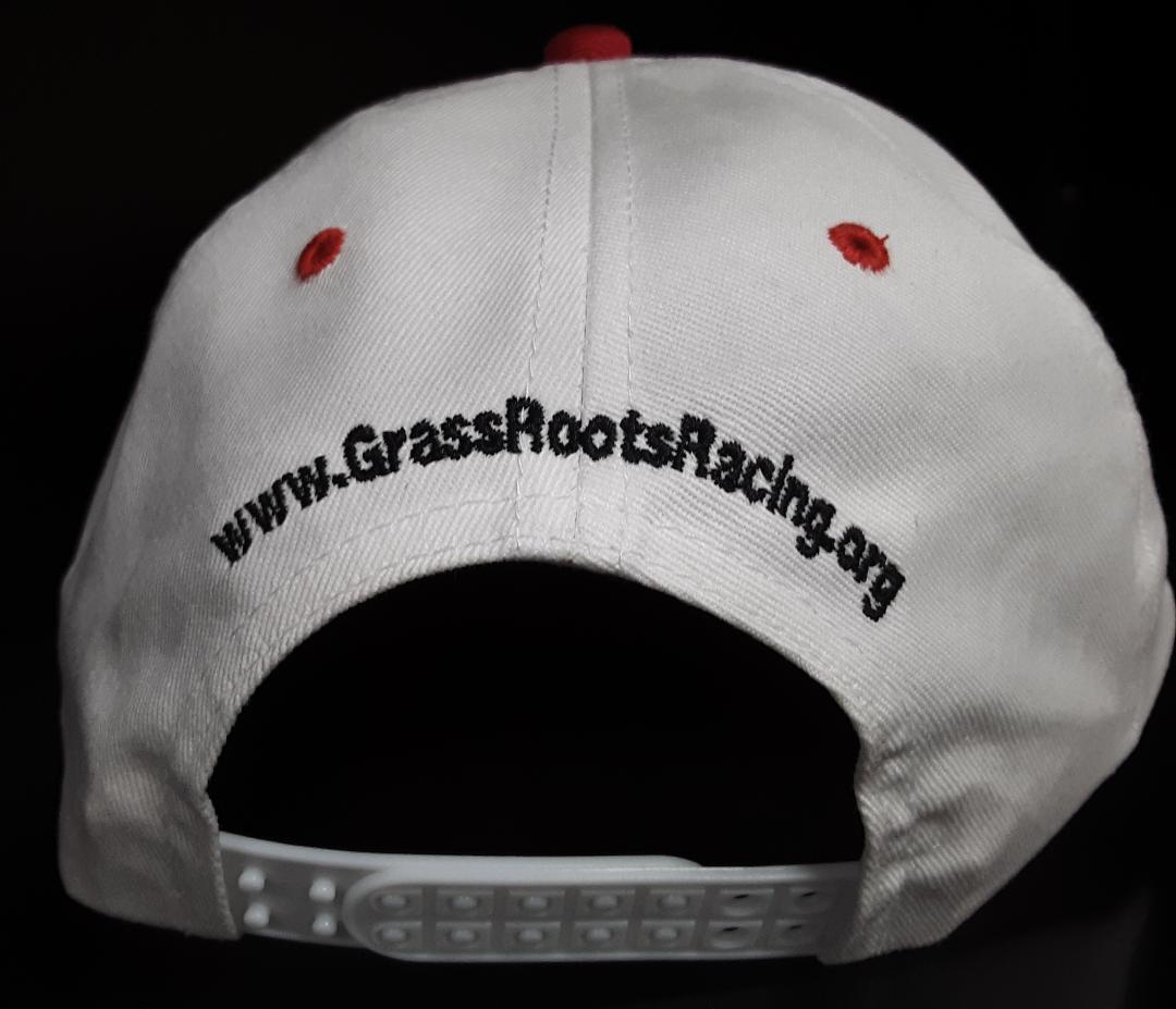 $8.00 – Grassroots Racing Show White Cap with Red Bill with embroidered logo, double snap closure