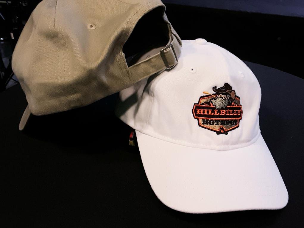 $10.00 Hillbilly HotSpot White or Tan Cap with embroidered logo, tuck strap with slide closure.