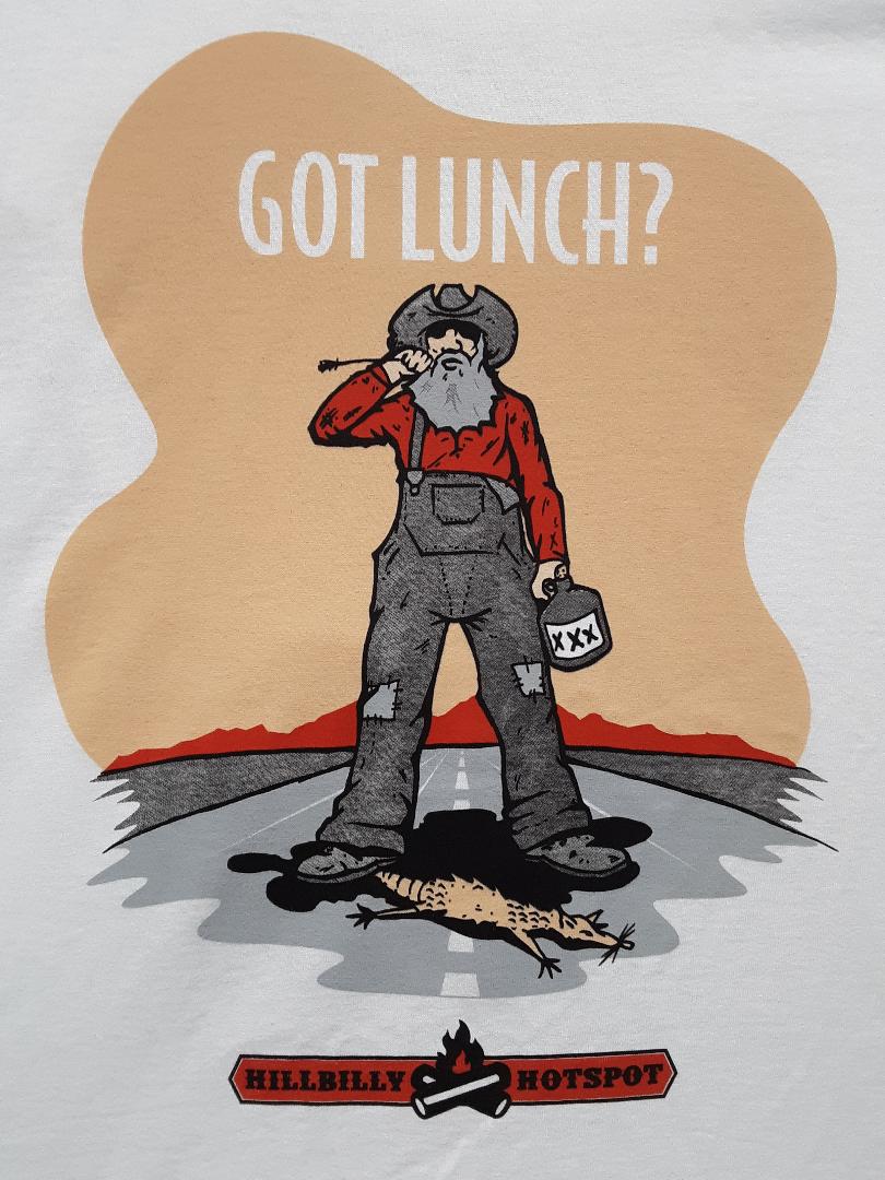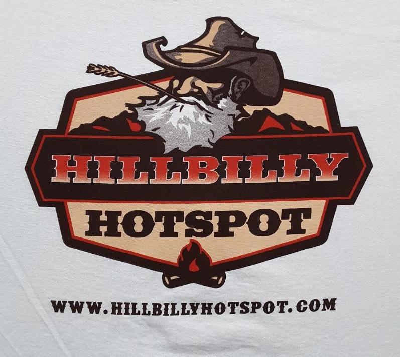$15.00 – Hillbilly HotSpot White Tshirt, screen print on front and back.
